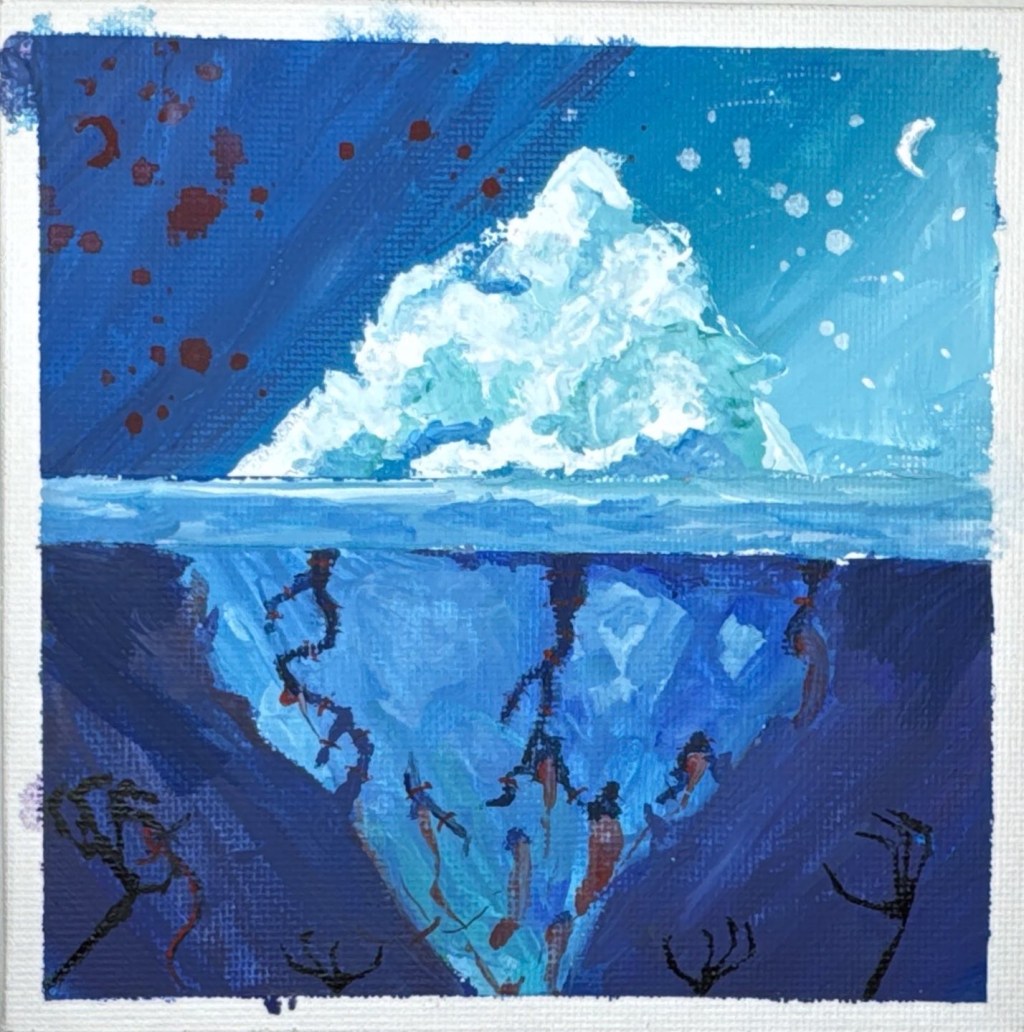 ‘Head Above Water’ reflects on the overlap between the patient and healthcare provider experience. The piece invites the onlooker to consider two interpretations: how easily one’s health can change, and the subsequent race to fix it; or how healthcare providers are the foundation which may never waver, even with cracks beneath the surface. This represents the emotional burdens of healing others. Both struggle to stay afloat, constantly in a battle against time.